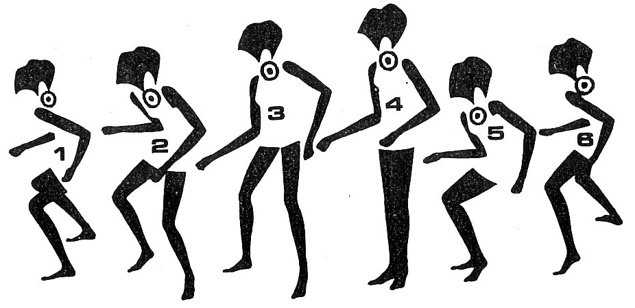 Step forward left, bending the knees and lowering the left shoulder (1). With knees still bent, step forward right, lowering the right shoulder (2). Step back left, beginning to straighten up, pulling the right shoulder back (3). Step back right, fully straightening up, pulling the left shoulder back (4). This can be varied by doing a quarter to the left over the course of the step.