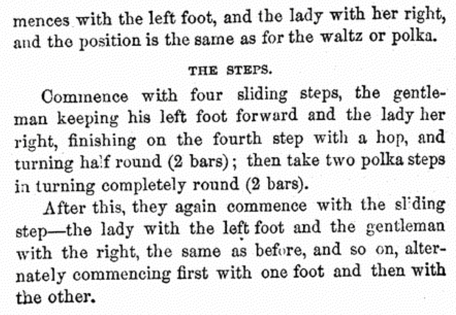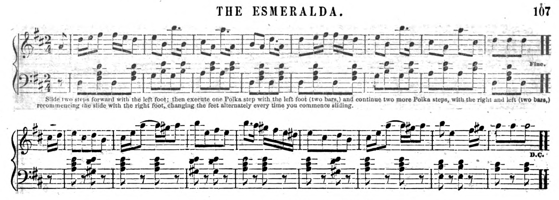 Note: Several sources use the name Esmeralda (or Three-Slide Polka) for a basic Four-Slide Galop [e.g., AD85, MW99], with one author noting that what everyone else calls the Esmeralda is "a pleasant way of varying this dance" [AD85].