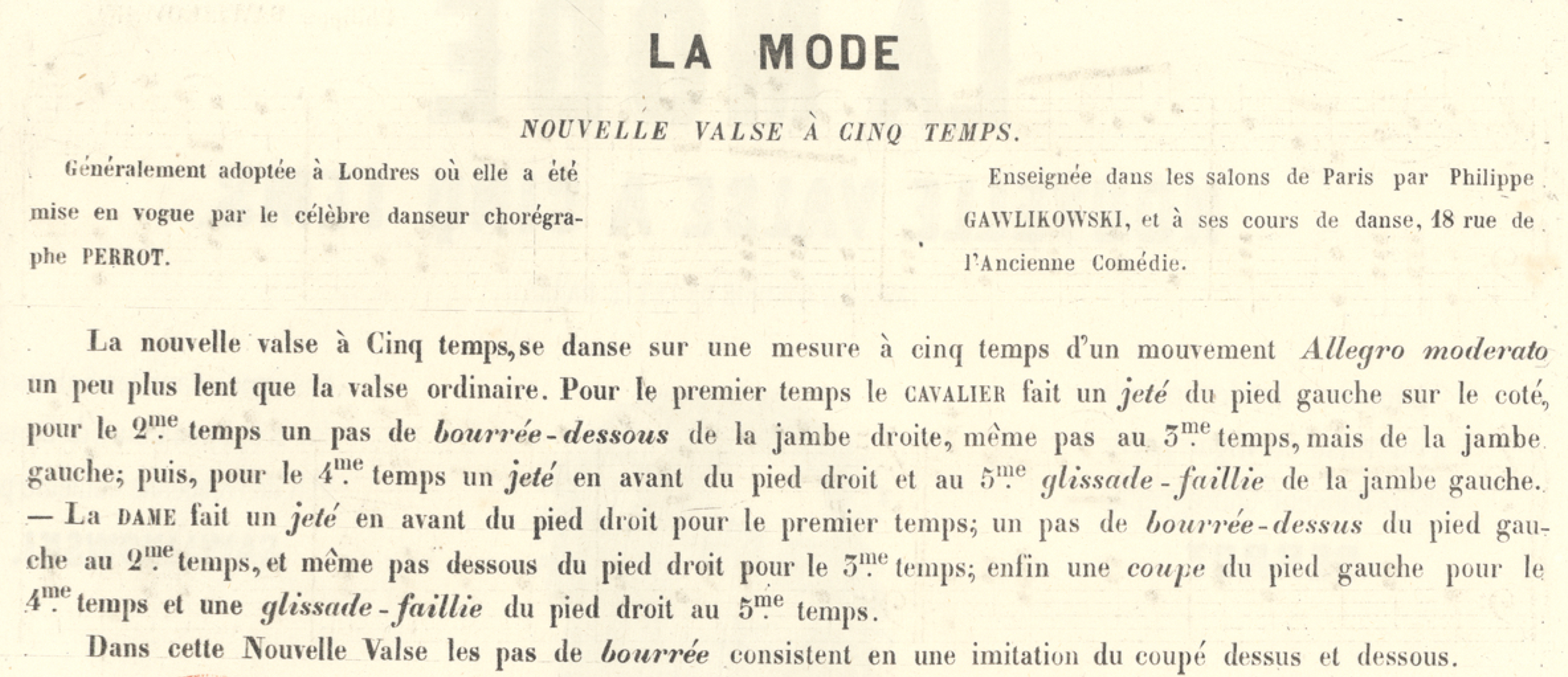 This is a five-step waltz composed by balletmaster Jules Perrot for the ballet Catarina in 1846. Descriptions were published in 1846 by Philippe Gawlikowski and 1847 by Henri Cellarius, but neither of these descriptions is clear enough to confidently reconstruct a comfortable version of the dance that is 100% faithful to them. What follows, therefore, is a simplified reconstruction that follows the spirit of Gawlikowski and Cellarius' descriptions, if not quite the letter of them [PG46, HC47a, HC47b, HC47c, HC49, CD56, HC58, EH58, LB67, ED70].
