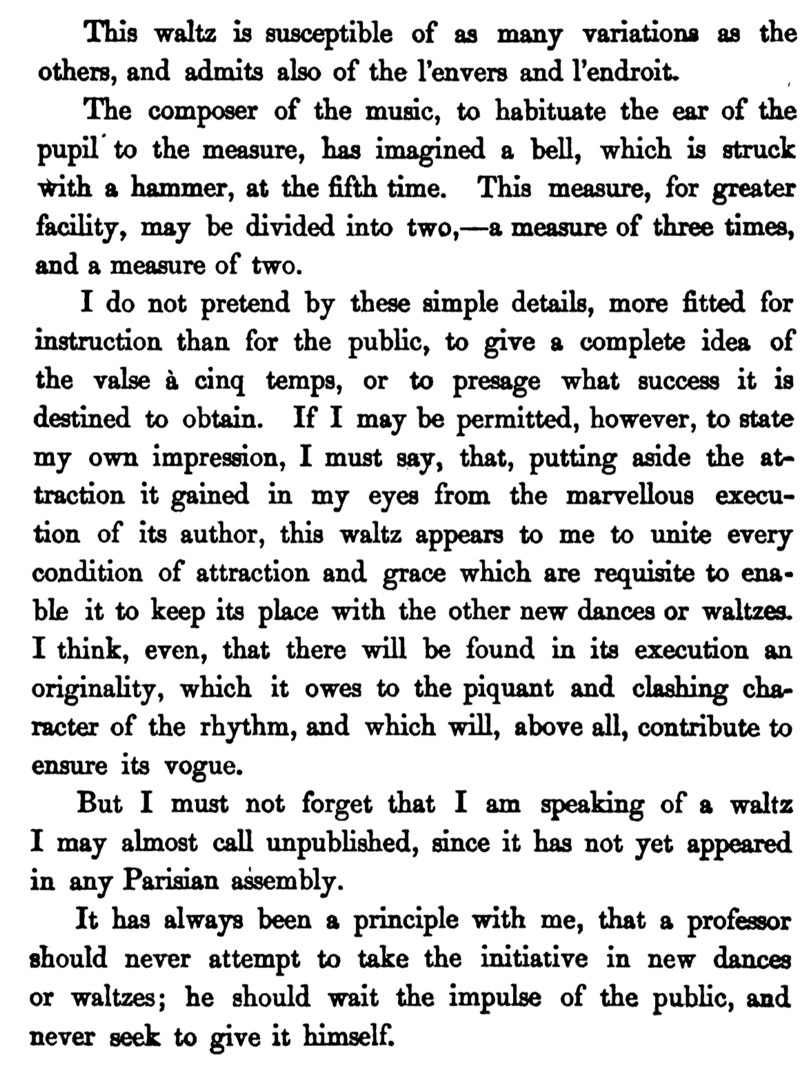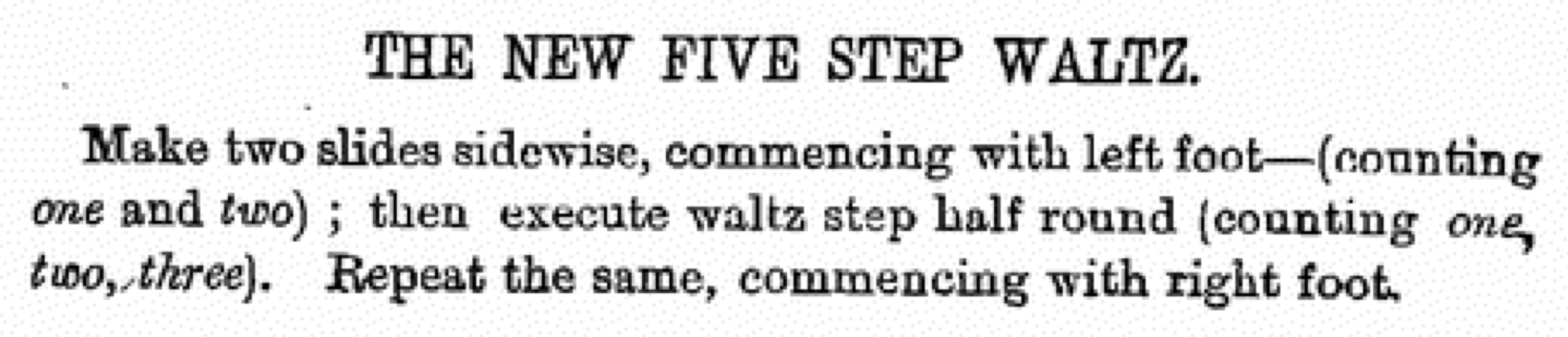 This "New Five-Step Waltz," described by P. Valleau Cartier in the late 19th century, is interesting because it splits the five counts into 2 + 3 instead of 3 + 2.