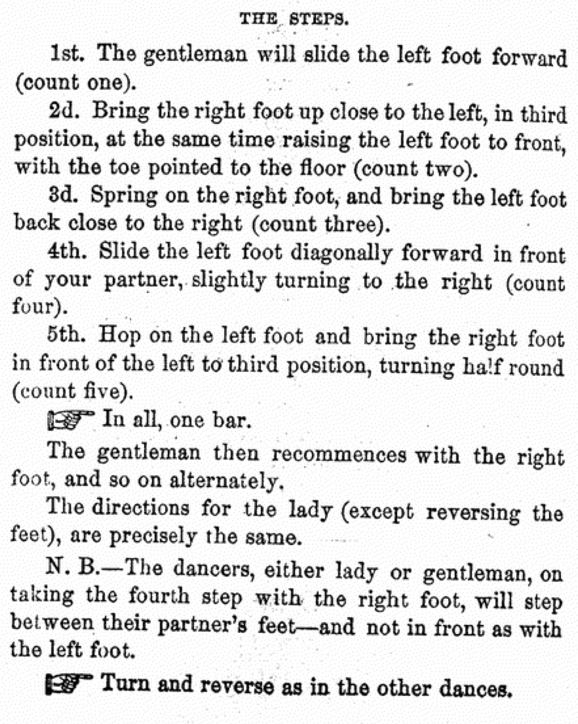 * The original description says "make two slides sidewise, commencing with the left foot," which could either be interpreted this way, or as two quick slide-closes (1-and-2-and). A single slide close is much more comfortable, so it's the Occam's Razor solution. This is also consistent with the living tradition Balfolk version, which is waltz-2-3-side-close. An early 20th century "Five Step Waltz" also uses a single slide-close, but in this case it's in 3/4 time and has the side close first, like the 19th century version (side, close, waltz-2-3 in 1, 3, 4, 5, 6 timing) [FC14a, FC14b].