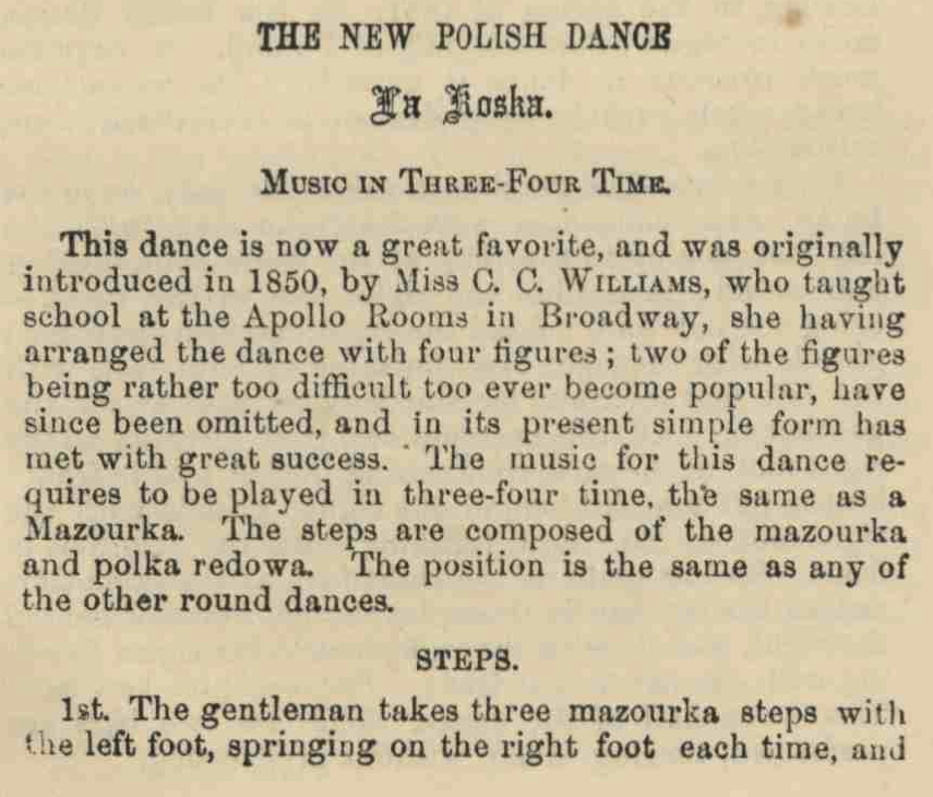 According to the first known description of the dance in Hillgrove's 1857 Scholar's Companion, it is a Polish dance that was introduced to New York in 1850 by Miss C. C. Williams. Hillgrove says that it originally had four figures, two of which were too difficult to become popular. A simplified version of the dance composed of the two easier figures was said to be a "great favorite" in 1857.