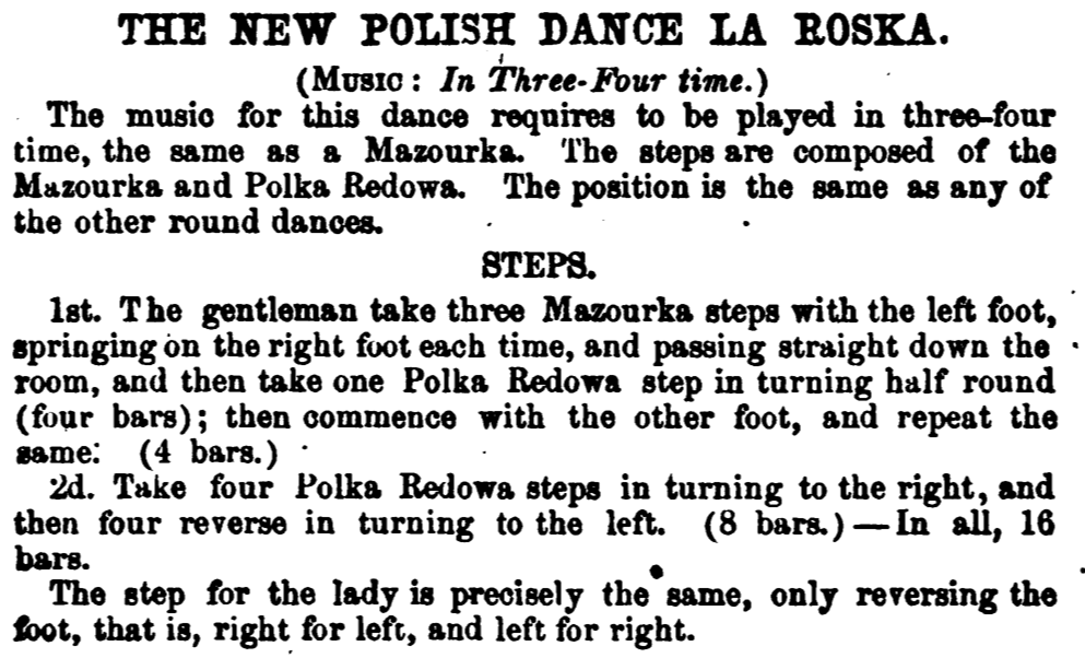 Elias Howe [EH68] provides a snippet of music specifically for the dance.