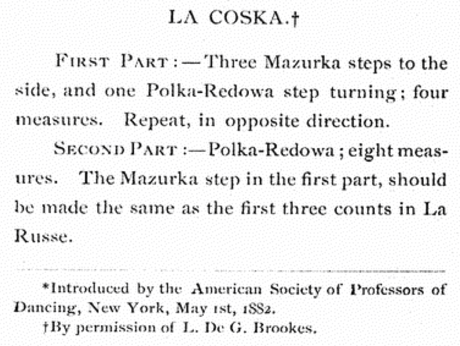 In 1867, Laurence De Garmo Brookes claimed that he composed the dance and introduced it in New York in 1850. It's possible that he did—perhaps he co-introduced it with Miss Williams—or it's possible that he was just trying to claim a popular dance as his own creation . Without further evidence, we can't know for sure. We do know, however, from newspaper advertisements, that Brookes and others were teaching La Coska in 1857.