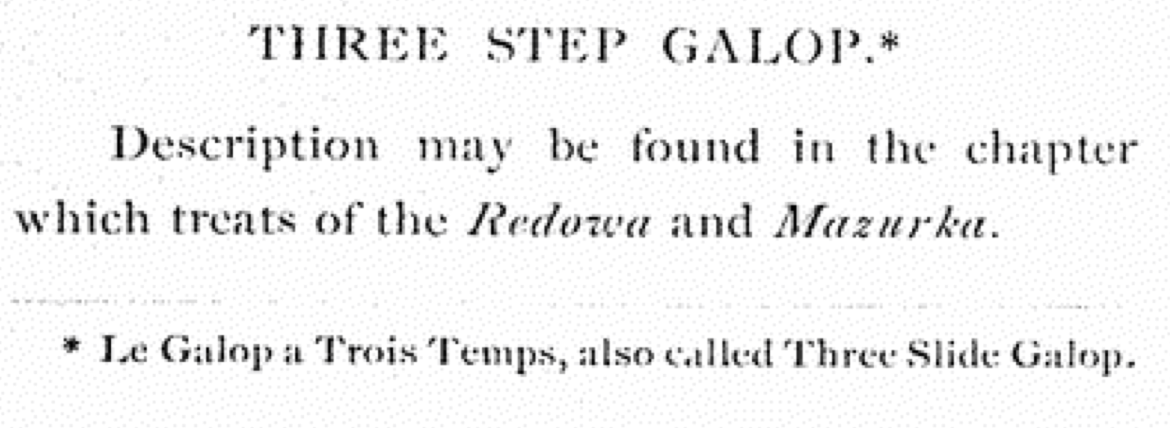 The Three-Slide Galop is a fun adaptation of Galop to waltz time, which appeared in De Garmo's Dance of Society (1875) and several other manuals in the late 19th century.